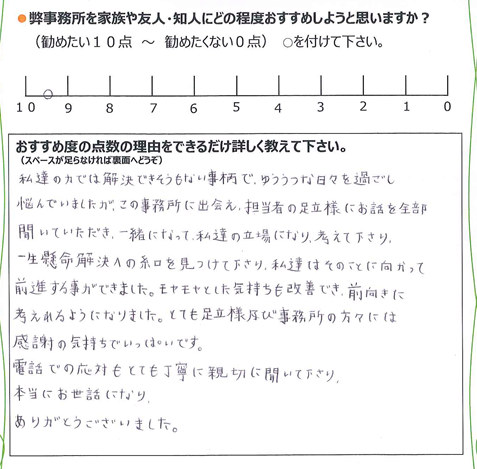 私達の力では解決できそうもない事柄で、ゆううつな日々を過ごし悩んでいましたが、この事務所に出会え担当の足立様にお話を全部聞いていただき、一緒になって私達の立場になり、考えて下さり、一生懸命解決への糸口を見つけて下さり、私達はそのことに向かって前進する事ができました。
